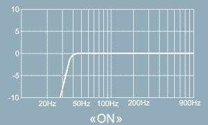 При необходимости получения линейной АЧХ для работы с полнодиапазонными акустическими системами на студиях или в кинотеатрах входной фильтр может быть отключен (на каждом канале отдельно) переключателями, расположенными на задней панели усилителя. Частотные характеристики усилителя мощности (в области низких частот) при включенном и отключенном входном фильтре показаны на рисунках.
